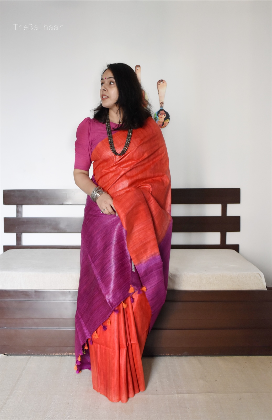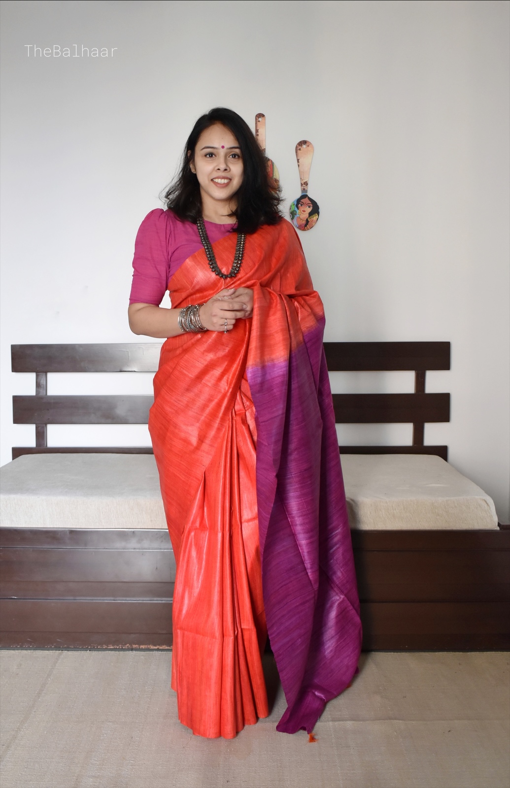 The natural gicha texture combined with soft tussar silk and a contrasting pallu gives the saree a graceful yet contemporary appeal.