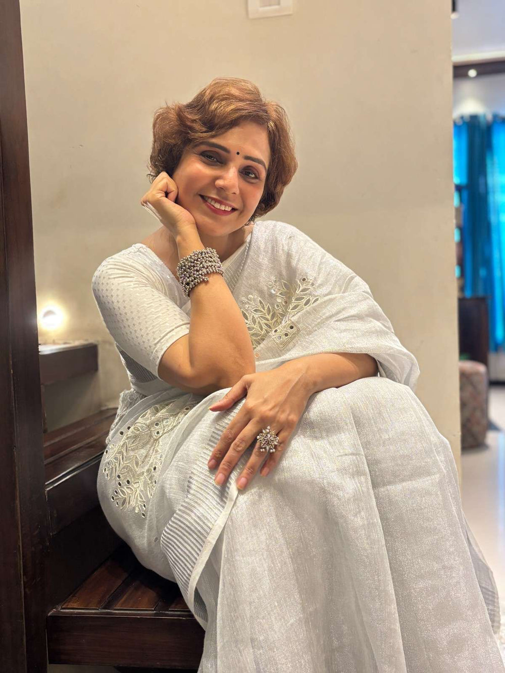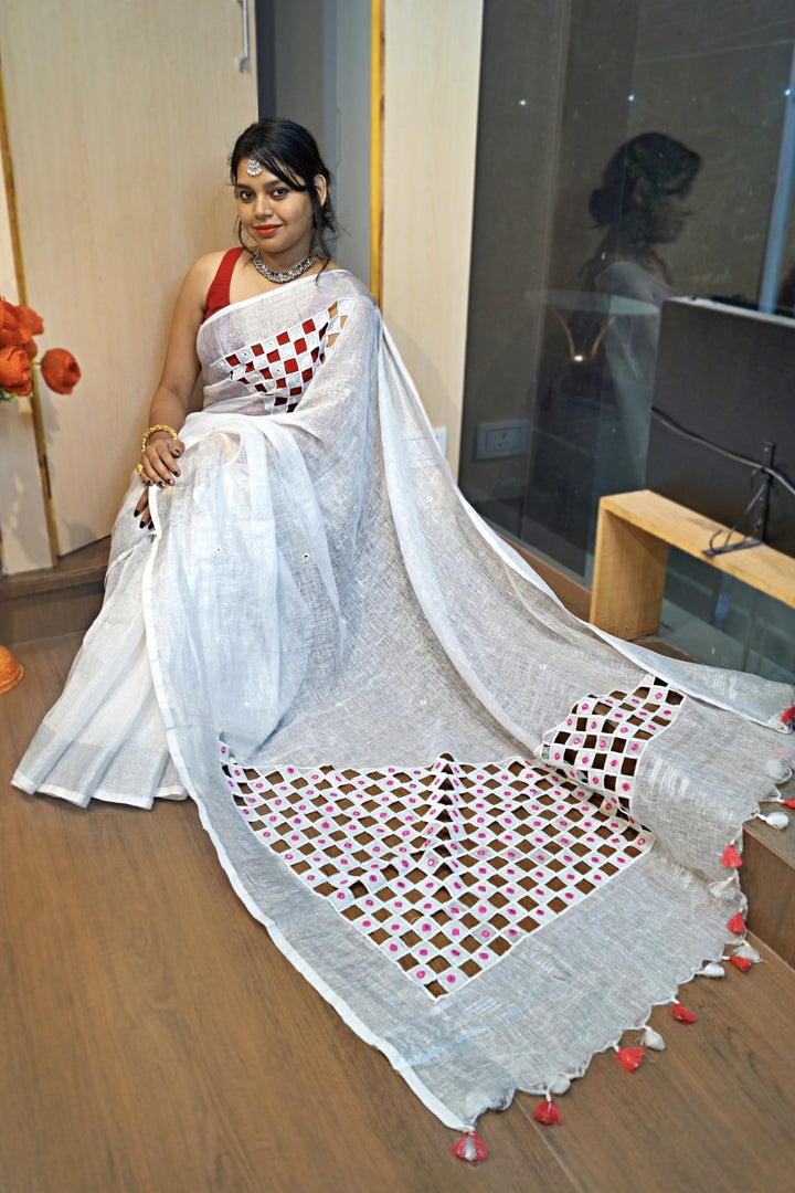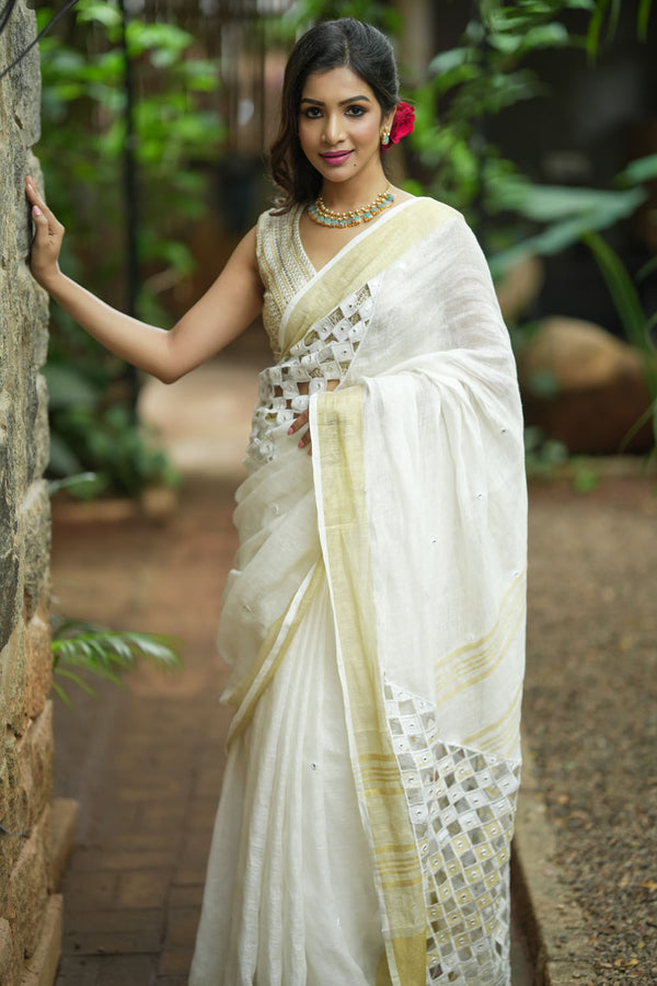 Linen Cutwork Saree with Running Blouse | Premium Handcrafted Cutwork – IZMA